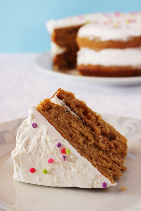 Cubrimos un bizcocho con crema, colocamos el otro sobre el y cubrimos el segundo con más crema. Para adornar pueden agregar coco rallado, chispas de chocolate oscuro, almendras fileteadas, lo que deseen. Yo usé unos lindos sprinkles para darle un toque sutil de color.